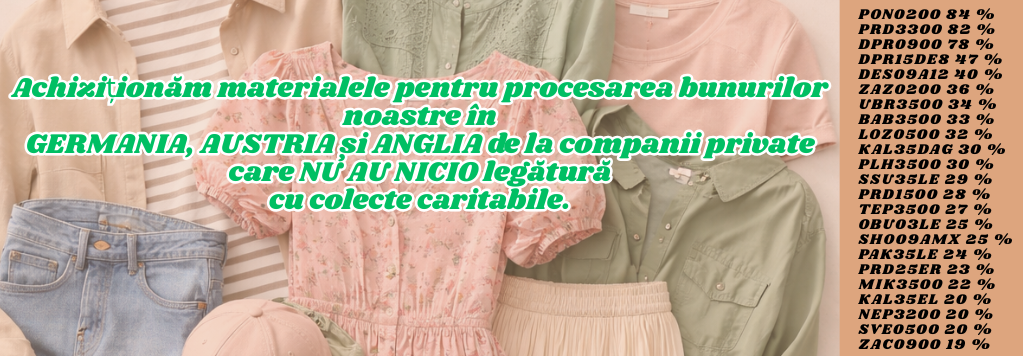 Din 1991, suntem angajați în importul și prelucrarea ecologică a textilelor colectate din Germania, Austria, Țările de Jos și, bineînțeles, Anglia. Trimitem bunurile noastre clienților noștri la magazinele de textile second-hand, la e-shop-uri și la vânzătorii de pe piață. Satisfacția dumneavoastră este marele nostru angajament. Apreciem foarte mult succesul nostru în România, unde furnizăm din 2016.